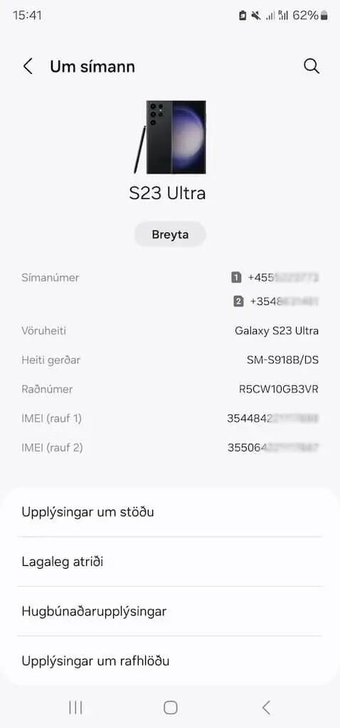 IMEI (International Mobile Equipment Identity) er 15-stafa raðnúmer sem öll fartæki eru með. Þú finnur IMEI númer utan á kassa tækisins eða í stillingum undir “Um símann”.