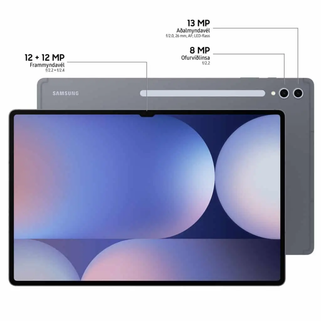 Galaxy Tab S10 Ultra er sú stærsta og sú besta. Fáguð hönnun og ótrúlegur kraftur gerir þessa vél að fyrirtaks kosti fyrir fagmenn og fagurkera. Góð litadýpt og mikiil upplausn býður þér upp á frábæra upplifun hvort sem er við áhorf á þínu uppáhalds sjónvarpsefni eða við grafíska vinnu. S-penni sem festist við bakhlið spjaldtölvunnar er sérlega hentugt verkfæri – einkum fyrr alla sem eru drátthagir. Vélin er að sjálfsögðu með íslensku notendaviðmóti auk þess sem Tab S10 línan er öll vatnsvarin skv. IP68 staðli.